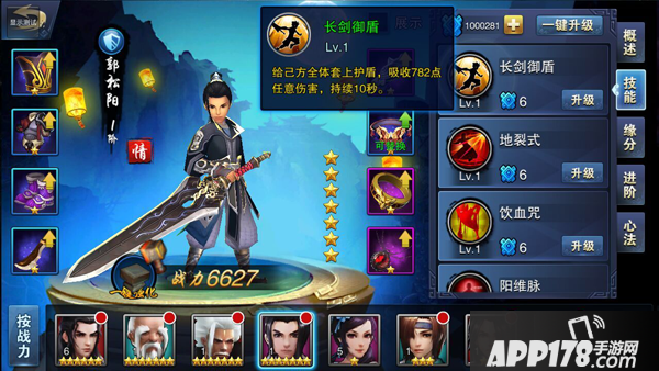 长剑御盾:给己方全体套上护盾,吸收n点任意伤害,持续10秒