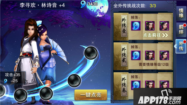 外传是情缘的副本,是获得勾玉的最好途径,每种都有三种难度,需要带相应的情缘侠客上阵才可以进入,一天最多挑战3次。