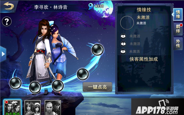 情缘技能是小李飞刀一大特色,都知道李寻欢和林诗音是一对苦情鸳鸯,他们之间肯定有情缘技能了,当你收集齐这两个侠客后会提示让你激活,激活之后是需要勾玉来升级的。情缘点升级越高,技能伤害就越大。当然还会给上阵侠客带来一定的属性加成!