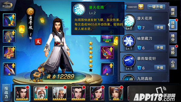 漫天花雨:向周围快速发射飞镖,多次伤害,每次造成n点外功伤害,较弱的敌人被击退