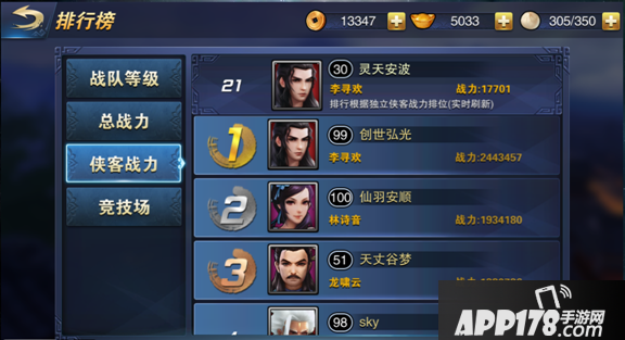 侠客战力排名:根据玩家战队各侠客的战力进行排名