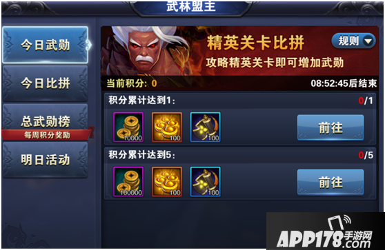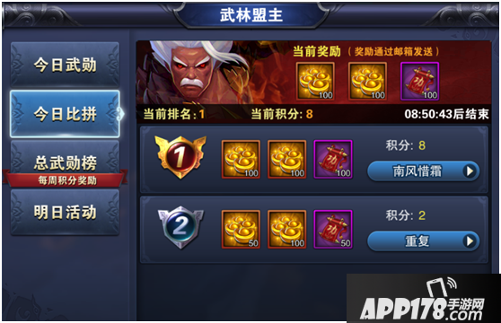 今日比拼:根据玩家积分进行排名,排名奖励通过邮箱发送