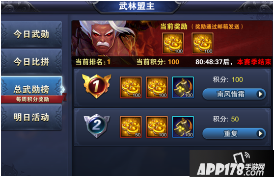 总武勋榜:根据玩家获得的武勋进行排名,排名奖励通过邮箱发送