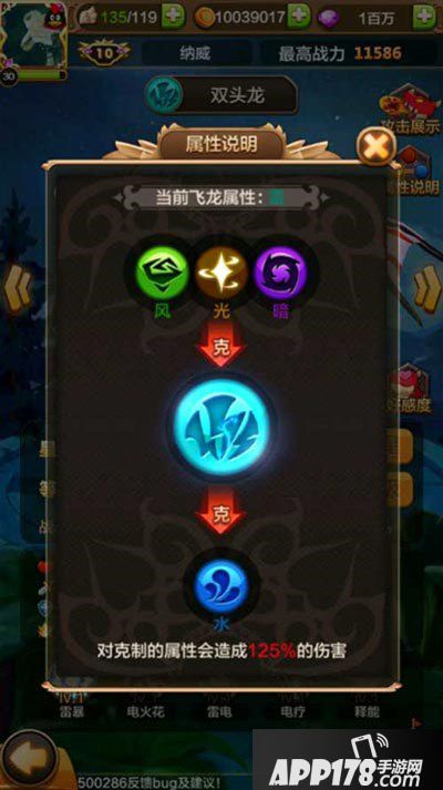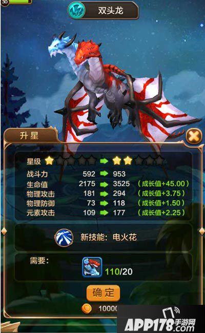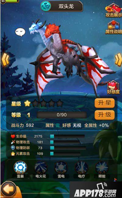 【双头龙】初始战力为592,其中,生命值2175、物理攻击181、物理防御73、元素攻击109,从各项数值我们可以看到双头龙拥有不错的攻击及防御,尤其是防御较高。