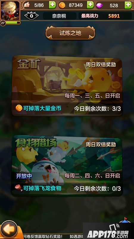试练副本位于主界面的正下方,在这里我们看到有两种模式,金矿和食物猎场。