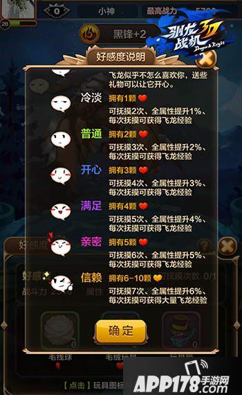 飞龙和勇者之间的好感也是游戏中的一大特色,从无视到信赖共有7个好感度层次。提升飞龙的好感度,不仅能获得大量的钻石和金币,而且随着好感度的增加,抚摸的次数也会增加。每次抚摸还可以获得相应飞龙的经验,提升飞龙等级,飞龙在战斗中带来的属性增益也会越来越大。提升好感度需要的是玩具,玩具可以通过飞龙大冒险获得,在签到和任务奖励中也会有很多的飞龙玩具发放。需要注意的是,玩家与飞龙之间的好感度是需要维持的,每过4小时就会减少一颗心,只有经常送玩具给飞龙才能更好地与飞龙维持亲密关系,飞龙也会以更加强劲地战力来回报你。