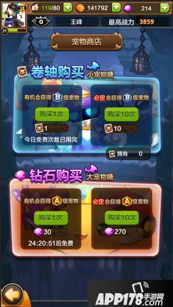 首先玩家进入游戏后在主界面点击左下角的宠物就可以进去宠物界面。在宠物界面中可以在界面右上角的宠物商店来挑选自己的宠物,玩家可以通过宠物卷轴和钻石来获取宠物,还可以通过系统每日赠送的抽奖次数获取宠物。