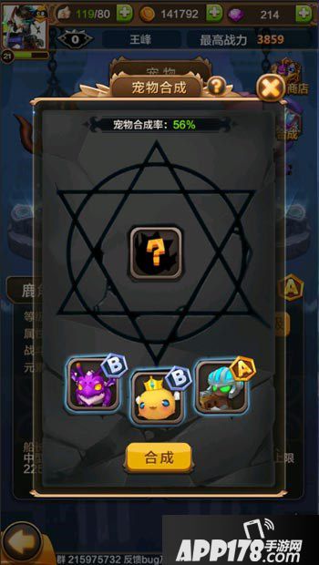 玩家在宠物主界面中可以通过右上角的合成按钮来进行宠物合成,宠物合成有几率获得更高一阶的宠物。宠物的品阶越高基础和成长战斗力也越高,如B阶宠物初始战斗力为88;A阶宠物初始战斗力为106。宠物合成的数量要求为3个,玩家选择宠物合成时可以在上方看到目前三个宠物合成的成功几率。