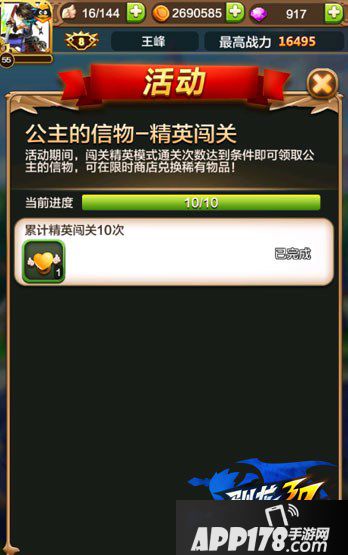 2、活动期间玩家每日通过精英关卡10次可以领取公主信物*2。