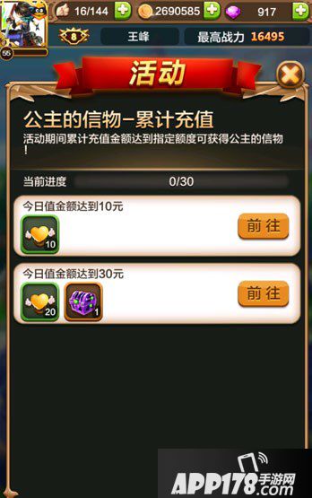 当玩家当日累积充值金额达到10元和30元的时候,可以分别领取到10个和20个公主信物。