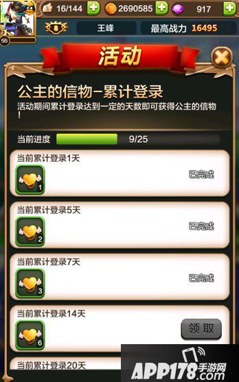 1、活动期间玩家每日通过普通关卡20次可以领取公主信物*1。