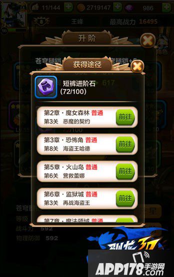 需要消耗道具短裤进阶石。玩家可以从普通关卡第2章第3关、第3章第8关、第5章第6关、第6章第3关、第7章第3关、第8章第8关、第10章第6关、第12章第3关、第12章第8关来获得。苍穹腿铠每提升10个等级需要进阶一次,随着进阶等级的提高需要短裤进阶石的数量也随之提升。(装备等级不可以超过玩家当前等级)