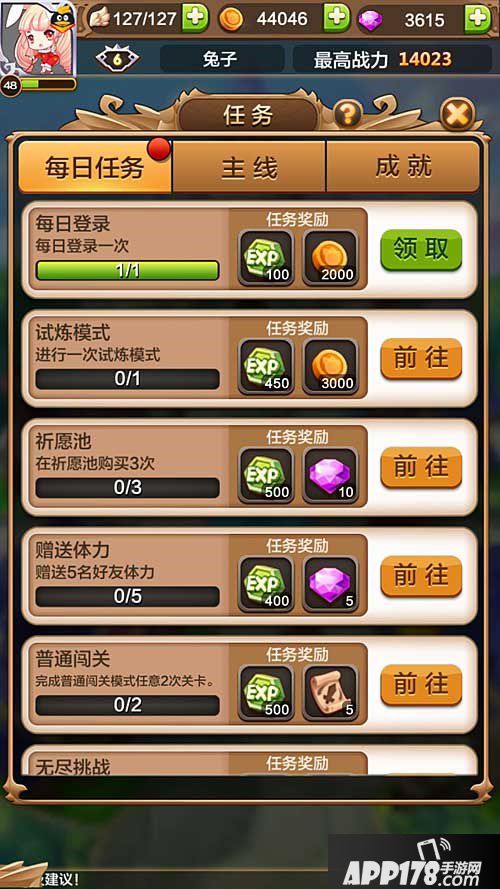 无论是刚进入游戏的新手玩家还是已经小有所成的老玩家,都不得不承认,每日任务里所赠送的任务奖励实在太超值,特别是新手,通过完成每日任务可以超速提升等级。登录游戏,送100经验!赠送5名好友体力,送400经验!完成2次普通关卡,送500经验!进行1次无尽模式,送500经验!以当前60级为例,可供完成的每日任务多达8项,全部完成总共能够获得3200经验、25钻石、5000金币、5扫荡券、2中宠物糖。而赏金任务会在12点、18点、20点、22点这4个时段出现,在这几个时段内上线就能在界面中间的驯龙公主那领取了,任务很简单,多为提升宠物技能1次或提升飞龙等级1次等,在限定时间内完成可获得奖励,奖励包括钻石和扫荡券。
