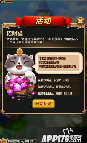 活动规则:在活动期间,所有骑士都可以登录游戏参加游戏参与活动哦!消耗钻石投入招财猫,可以获得1-X倍钻石,同样特权越高大家获得的钻石越多哦!