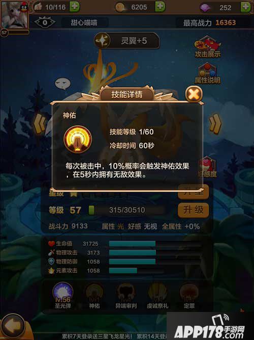 第二技能神佑:每次被击中,10%概率会触发神佑效果,在5秒内拥有无敌效果。