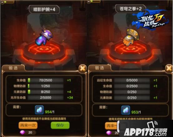 值得注意的是,除却角色通用的生命值、物理防御、元素防御三个锻造属性之外,《驯龙战机3D》对于每个角色的装备锻造附加了一条额外的属性。如:雷德的额外装备锻造属性是强化远征生命、斯嘉丽的则是对无尽生命值的强化、公主菲儿则获得了对战元素防御的额外锻造属性。如此设定,强化了游戏现有的三大角色区别,使角色的对战更有针对性。