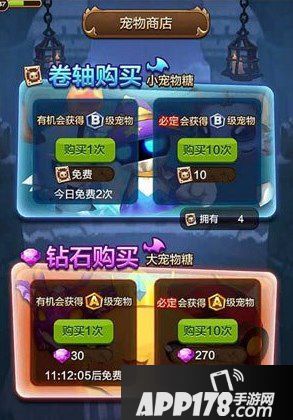 2.宠物商店:宠物商店每天都有三次卷轴免费抽取的机会,这个是比较容易获得宠物糖的,但是卷轴购买时有机会获得B级宠物(如果你有宠物抽奖券的话,你还可以凭抽奖券抽取),钻石抽取,是相隔一定时间可以免费抽取一次,你也可以直接钻石抽取,钻石抽取有可能会获得宠物糖还有机会获得A级宠物。