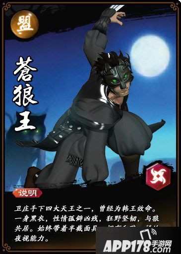 苍狼王,卫庄手下四大天王之一,曾经为韩王效命。一身黑衣,性情孤僻凶残,狂野坚韧,与狼共居。始终带着半截面具,拥有和狼一样的夜视能力。