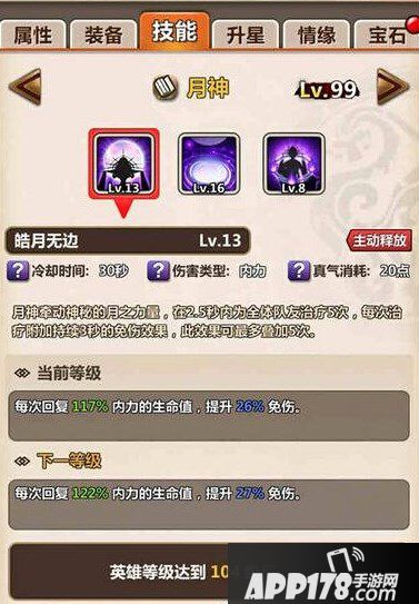 游戏中,月神被定位为后排辅助型英雄,她的主动技能拥有免疫伤害和为队友加血的技能。被动技能“水月幻境”可以在攻击敌方的同时恢复队友的生命,另一个被动技能“封眠咒印”可以使当前的敌方单位暂时封印所有技能且受到持续伤害。