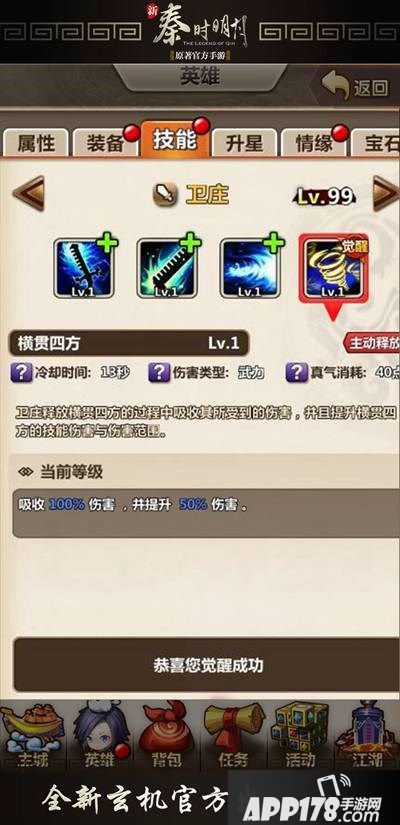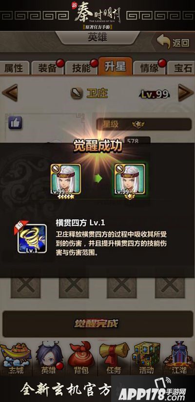 觉醒完成后卫庄即可获得全新的觉醒技——横贯四方。该技能释放过程中吸收其所受到的伤害,并且提升横贯四方的技能伤害与伤害范围。