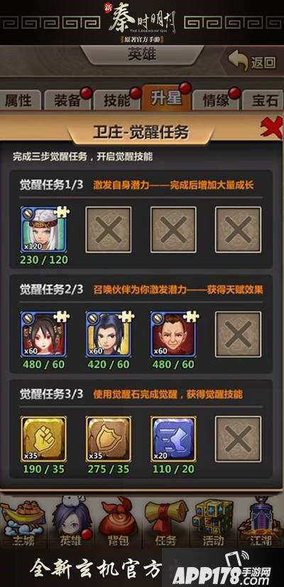 任务三:使用觉醒石完成觉醒,收集35个觉醒石(力)、35个觉醒石(盾)、20个觉醒石(避),点击完成觉醒即可成功觉醒。