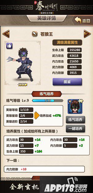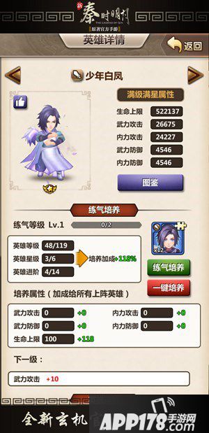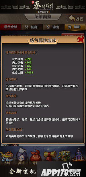 所谓练气培养系统,是指玩家们可消耗英雄信物在已经获得的英雄身上,提升该英雄练气等级。随着练气等级的上升会给玩家的整个队伍增加不同的属性。其中包括武力攻击、内力攻击、武力防御、内力防御和生命上限5个方面。