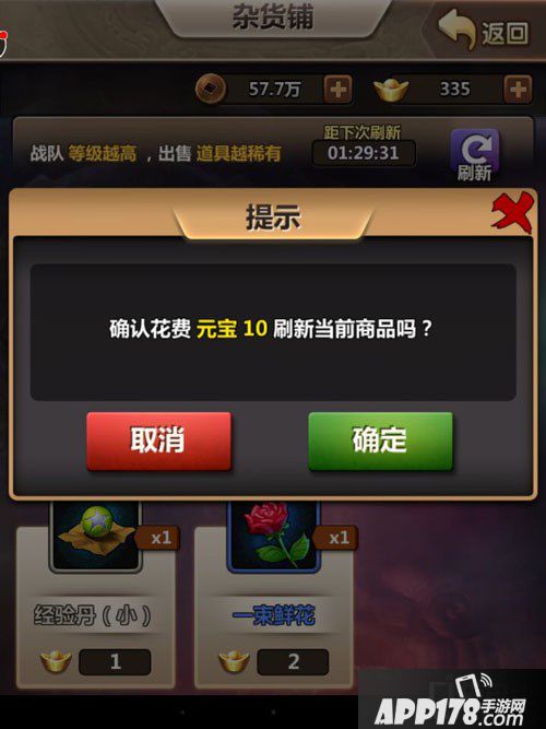 如果杂货铺没有我们心仪的商品,那么我们可以通过点击右上角的刷新按钮来刷新一下,不然就需要等一个半小时系统自动刷新。不过手动刷新是要元宝的。