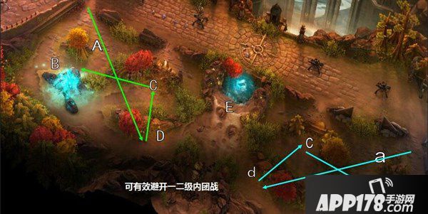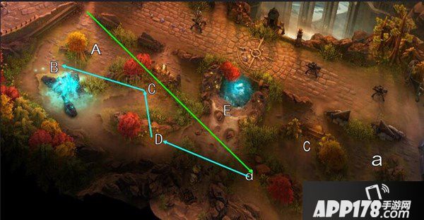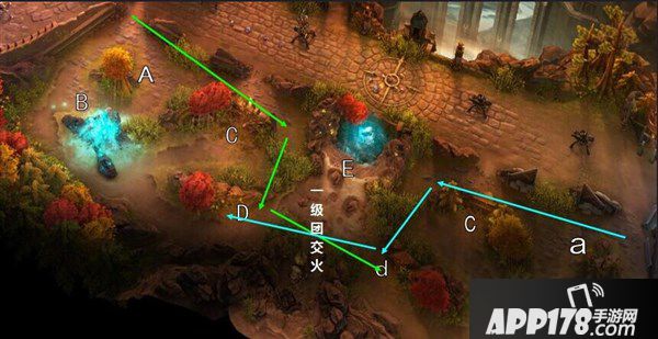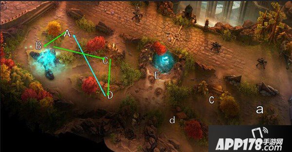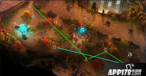 一般情况下理想的打野状态应该是1名线上,2人野区。如果团队有2名远程英雄,则保证1名近战英雄打野。组队时无论是3名近战英雄还是3名远程英雄,都尽量避免3人在野区或者3人都在线上,这样影响经济和发育。 我们用A-D分别表示我方野怪,小写字母为敌方。绿线为进击路线,蓝线为折返路线或敌人路线。