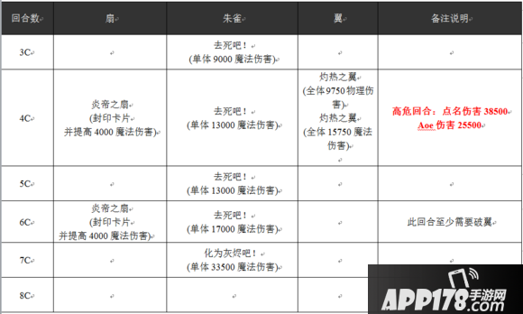 由于伤害基本在翼上,所以推荐6c优先破翼保平安,4c回合是一波很好的输出时间,推荐富豪嘲讽或者使用高质量盾保证队伍安全,其他职业叠chain输出,盗贼有单体魔妨也可以丢本体,6c前破掉翼即可。然后一波炸死扇和本体。Boss封3c卡所以各职业尽量少带不必要的3c卡以免被封关键卡,锅姬留解封给兵防4c被封即可。