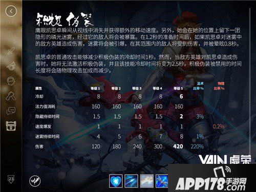 凯思卓的二技能积极伪装是游戏中唯二的隐身技能,凯思卓隐身后会留下一团迷雾,在迷雾中的敌人一旦遭受伤害,将被晕眩0.8秒。在采用武器出装后,二技能隐身时间极短,更适合用以防御和撤退。