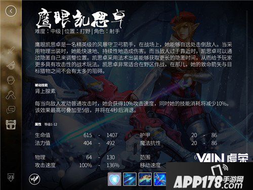 移动电竞,就看《虚荣》!风暴守卫中的冷面射手鹰眼凯思卓本周正在限免。作为《虚荣》中的热门英雄,凯思卓对操作有一定要求,一旦瞄得准,则输出极为可观。对新手玩家而言,在对线时,采用武器出装,以一技能辅以普通攻击,是一个不错的选择。以下就是小编为大家带来的凯思卓基础对线攻略!