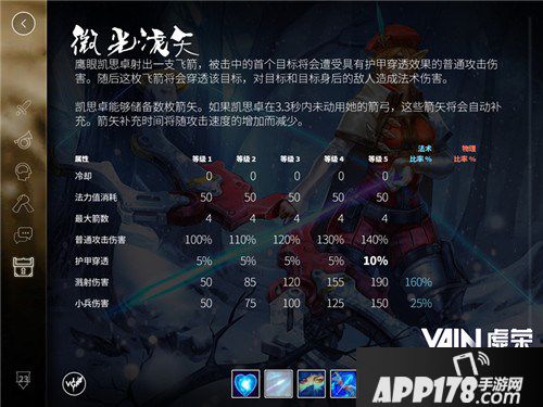 凯思卓的一技能流光微矢是其主要的输出技能,该技能无冷却,最多储备4枚箭矢,如果凯思卓在3.3秒内未进行攻击,则储备箭矢将自动补充,补充速度受攻速影响。需要注意的是,凯思卓的一技能是对击中的首个目标造成穿透普伤。所以,对敌方英雄发起攻击时,一定要注意敌方小兵的位置。一旦敌方英雄以小兵为掩护,则一技能很有可能被遮挡,从而使伤害大打折扣。