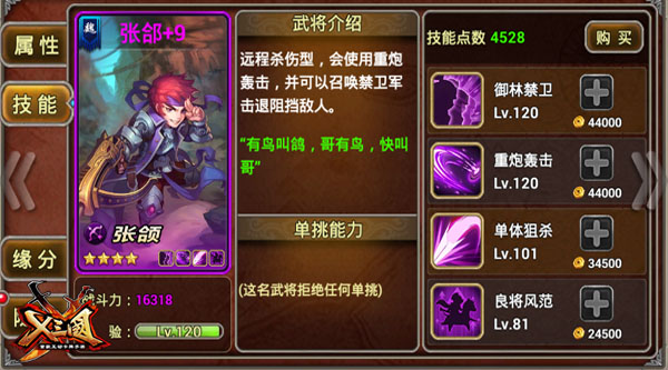 曹操帐中以巧变闻名天下的西征将军张郃也加入《X三国》,想必主公们早就在关卡中见识到这位大将的厉害之处了吧!张郃的大招“御林禁卫”竟然真的召唤出一名幻影战士共同抗敌!张郃的小招也非常炫目,重炮一出既有强大的穿透效果还能降低对手的护甲和魔抗。配合群伤魔法出众的诸葛亮,郭嘉的技能一起触发,妥妥玩爆大蜀国的神将们哦!欲知更多新将资讯,还请移步“武将图鉴”。