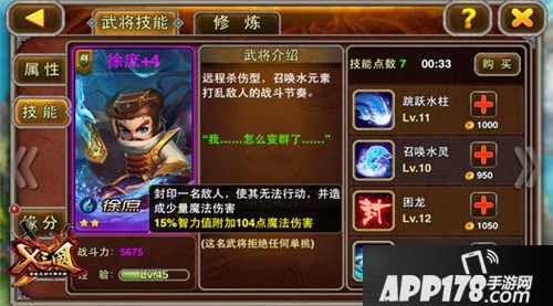 不过由于水灵宝宝过分抢镜,也让徐庶本身的战斗力被质疑。徐庶技能固然丰富,但整体的伤害却不高,战斗速度也显得有点缓慢!在《X三国》中,徐庶这种类型的武将培养的重点就是堆高攻击力,耗费的资源有点多,不推荐新手玩家持有!当然召唤系脑残粉,要细心培养徐庶这个萌将,也是欢迎滴!