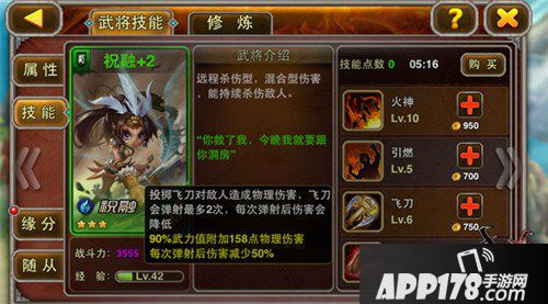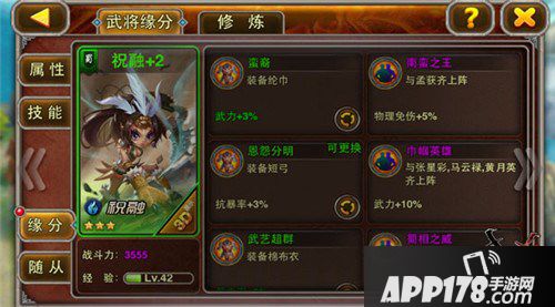 非R玩家的阵容中,绿将和蓝将还是相当重要的!祝融系统缘分中最常规的用法是她和老公南蛮王孟获之间的物免缘分!非R可以用3个绿将+2个蓝将或1蓝+1紫的阵容在前期打好基础,后期的绿将可以下野,也可以继续做援军!比起前期就全部紫将的阵容,绿将的阵容成本低很多咯!