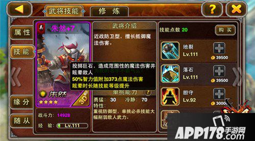 《X三国》中绝大部分前排防御型武将都是以物免和武力攻击为主的,可朱然却完全不一样。他的专长是“抵御魔法伤害”。这就意味着,碰上单挑位上的高武力,比如赵云、马超之类的,朱然就比较被动;而碰上纯魔阵容,且不喜欢出单挑位的主公们,可谓优势明显啦!