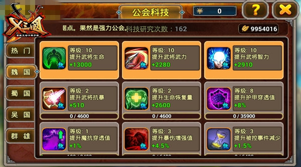除了霸气冲天的公会战之外,新增的公会科技和公会宝库也使得公会一下子高大上了不少!公会科技可以进一步提升公会的实力以及特别特别牛逼的武将属性。公会战中抢到的粮草资源就在这里发挥作用了哟!只要和基友们一起全力冲击公会战,传说中的神级武将分分钟手到擒来。从此以后,非R们再也不怕土豪的战力碾压了,全新的时代即将到来!