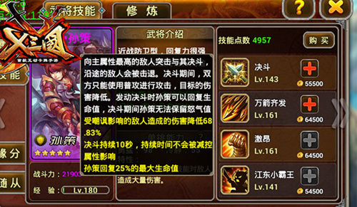 孙策的四技能是增加自身的武力和护甲,满级的孙策护甲并不逊色于张飞、典韦这些肉盾英雄。三技能每次普通攻击都会增加自身的攻击速度,配合上霸体的效果,即使普通攻击也可以带来不菲的伤害。