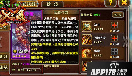 孙策的四技能是增加自身的武力和护甲,满级的孙策护甲并不逊色于张飞、典韦这些肉盾英雄。三技能每次普通攻击都会增加自身的攻击速度,配合上霸体的效果,即使普通攻击也可以带来不菲的伤害。