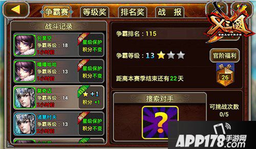 群雄争霸玩法其实很简单,就是不断提升自己的争霸等级,以获得更好的奖励!根据主公当前的争霸等级,系统随机给匹配相同等级的对手。战胜对手后,获得1积分,当主公处于连胜状态则获得两积分。赛季结束后,该赛季奖励将通过邮件方式发放到各位主公的邮箱里,并且清空上赛季的争霸等级和官阶。