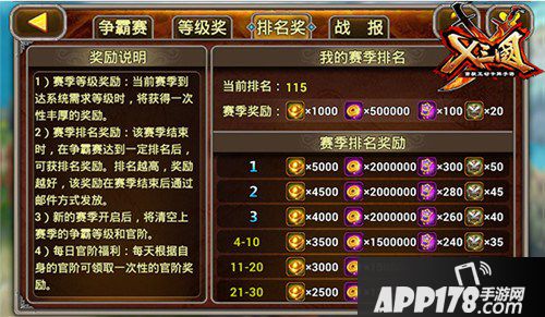 作为《X三国》的核心玩法之一,群雄争霸的奖励也是非常丰厚的。每个赛季结束时,根据主公的排名发放排名奖励。排名越高,奖励越丰厚,奖励包括元宝、金币、功勋、公会奖章。除了赛季奖励外,在当前赛季中达到系统需求等级时,还可以获得一次性丰厚的奖励。于此同时,排名不同,官阶不同。主公每天还可根据自身的官阶领取一次性的官阶奖励。