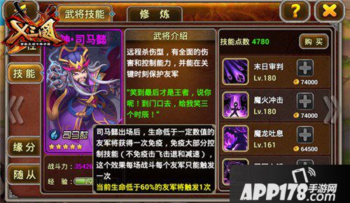 智力武将依靠技能输出,技能加成系数尤为重要,司马懿的技能加成系数普遍不低,二技能更是高达100%。司马懿除了拥有优秀的输出技能,被动技能晋国之祖,让队友获得一次免疫大部分控制技能的机会,因此备受广大玩家喜爱!