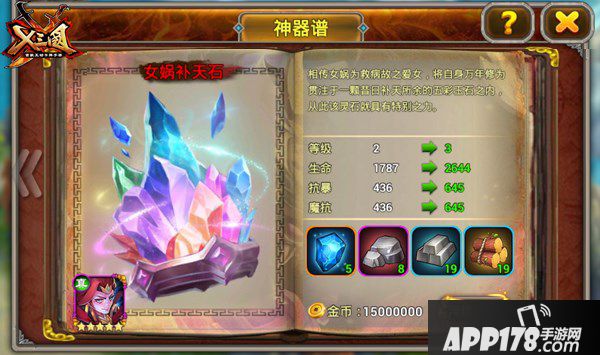 在游戏中,神器最高可升级至20级,升级消耗四种材料,除了第一种材料不同外,其他所