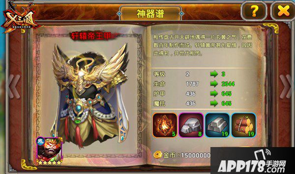 有适合输出用的蚩尤洪荒刀,那肯定也有适合肉盾英雄的神器,没错,这就是轩辕帝王甲。盔甲负责提高武将的生命、护甲、魔抗,正因如此,帝王甲才非常适合肉盾英雄使用。当然除了肉系英雄能够获益外,帝王甲还可以给输出英雄使用,毕竟在高分段战场中,抗性越高生存能力也就越强。