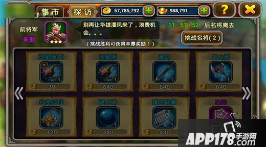 而在探访中,探访刷出来的名将都携带高级的道具,主公们有3次挑战他的机会,可以挑选手下大将和他进行单挑,将其击败后才可购买道具,3次都失败则名将消失哦,不过呢挑战成功或失败,都会有礼品赠送,挑战失败的道具差些,获得的将魂少些,只有2个左右,而挑战胜利的话,不仅仅能获得重铸石还能获得10枚将魂,再刷刷副本攒一攒,紫将轻松到手,推图打仗不再发愁~~