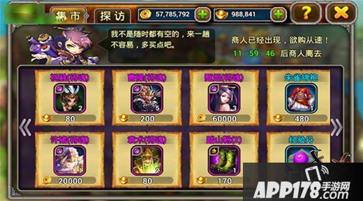 先来说说集市商人吧,每天召唤到以后会随机兜售各种道具、装备碎片、装备。主公们可要准备好你们的金币和元宝哟,随机商人将会在游戏内溜达12个小时,时间结束之后随机商人就会拍拍屁股消失哦。