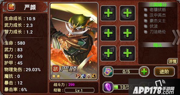 严颜:近战防卫型,嘲讽敌人强制其攻击自己,拥有很高的生命值。独白:“老大,你对一个六十多岁的老头子,还有什么要求?”(作者旁白:家有一老,如有一宝,黄忠没来,你就是宝啊。)