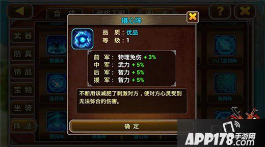 摄心阵:此阵与六丁六甲阵相生相克,前军的物理免伤只要上一个最肉的肉盾顶住,中军的武力加成和智力加成都能为后排创造出可观的输出,颤抖吧没有强肉盾的对手!