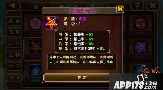 天罡北斗阵:以静制动,决胜千里,前军抗暴,中军后军都以提升暴击率为主,一击致胜加强势防守,打造敌人完全打不穿的铜墙铁壁!