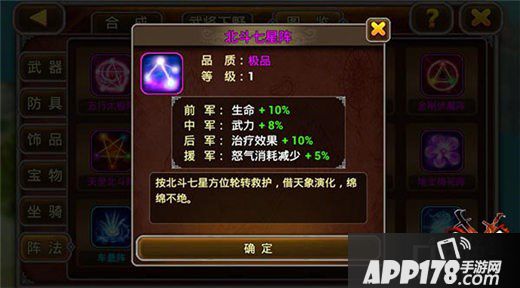 北斗七星阵:联手往复,流转不息,此阵中武将的生命值将连绵不绝,只要一个后排治疗就能按北斗七星的方位轮转救护,可谓相当神奇。细心的玩家一定也发现这可以说是六丁六甲阵的加强版,主军的生命和武力增加效果实在惊人!